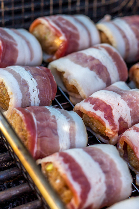 - Lightly oil hands to keep mixture from sticking. Using a large cookie scoop (1-2 tbsp size), scoop out mixture and roll gently into a circle and set aside. You will get 16 ping pong ball sized meatballs. Wrap each meatball in a half slice of bacon and place seem side down into a grill basket.