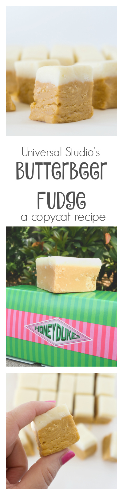 We stopped at Honeydukes in the Wizarding World of Harry Potter and came across a candy counter that all sorts of delicious things, but the Butterbeer Fudge caught my eye. We got one piece and everyone had a little sample and then begged for more. That’s when I knew I add to add a copycat butterbeer fudge to my list of easy fudge recipes.