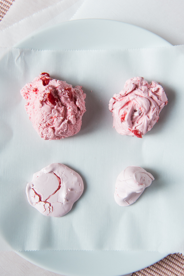 Here is a picture of 4 different stages of the divinity as it is being beaten for reference. The bottom left wasn’t ready when I tested it and the candy just puddled. The bottom right mounded nicely with a swirl on top, so I knew the divinity was ready for me to fold in the cherries. The top right is what your divinity will hopefully look like with smooth fudge-like swirls. And the top left is an example of a batch where I went too far and didn’t try to save it by adding a little hot water back into the candy mixture.