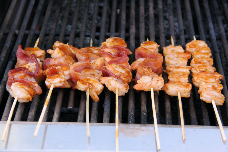 - Shrimp takes almost no time at all on the grill. Use a grilling basket or skewers (presoak bamboo skewers before putting on the grill to keep them from burning). Just a couple minutes on each side, brushing any sugary marinade half way through cooking.