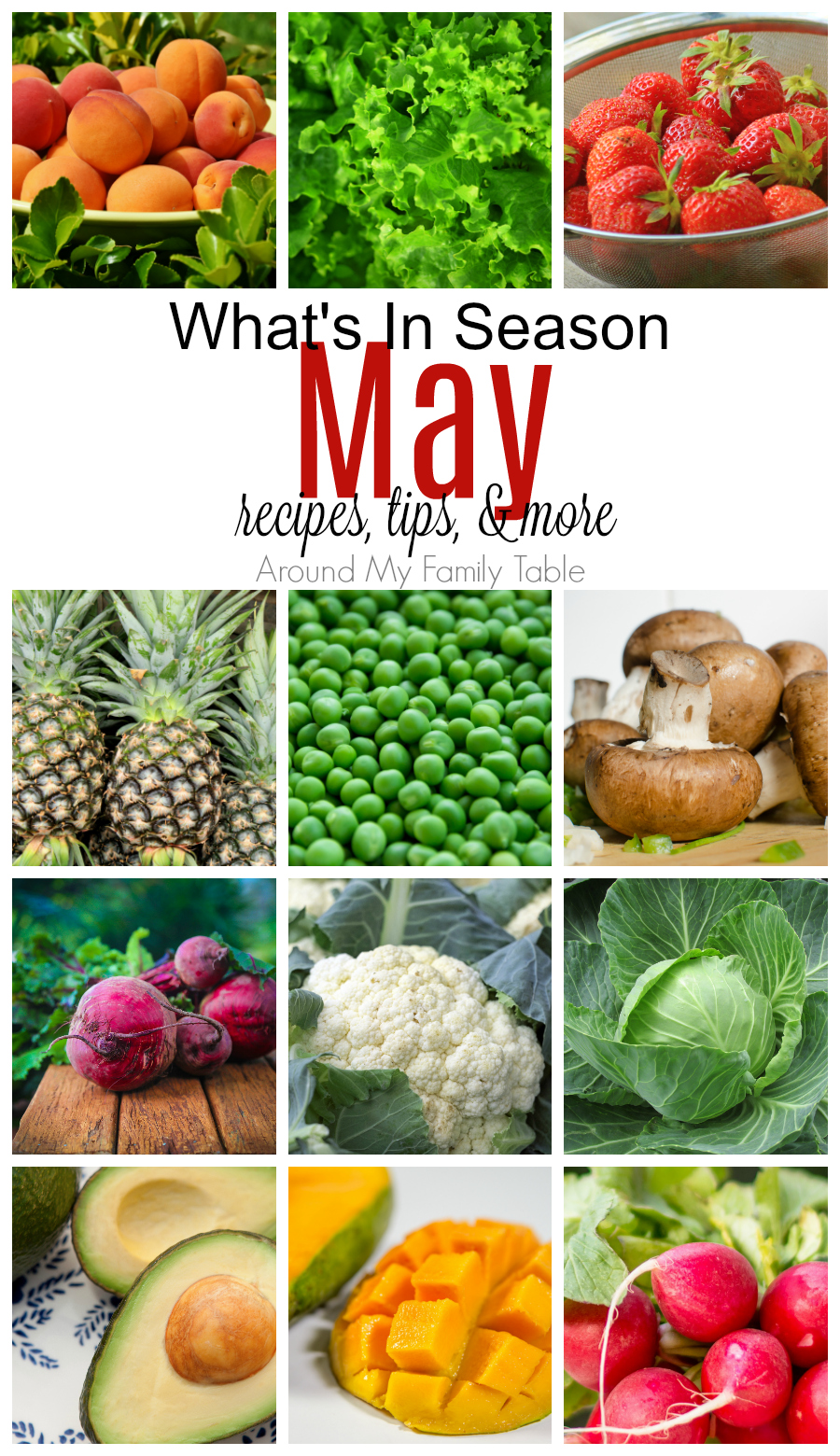 There is so much delicious produce in May and if you are like me, I try to save money at the store by buying produce that’s in season. It’s cheaper, it’s fresher, and it didn’t travel very far to get to your table. My May — What’s in Season Guide is your guide to May Seasonal Produce along with recipes, tips, and more!